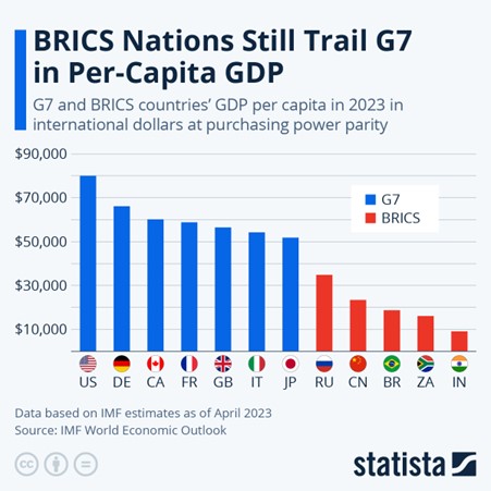 So, unlike the G7, which has increasingly homogenous economic objectives under the hegemonic control of the US, the BRICS group is disparate in wealth and income and without any unified economic objectives – except maybe to try and move away from the economic dominance of the US and in particular, the US dollar.